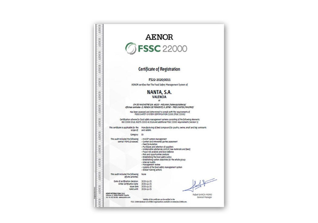 Con esta esta nueva certificación, que coincide con la conmemoración del 25 aniversario de la obtención de su primera certificación de calidad ISO 9001 por AENOR, de la que Nanta también fue pionera en su obtención a nivel nacional, la compañía refuerza aún más su liderazgo en seguridad alimentaria en el sector de los piensos compuestos. A lo largo de estos primeros meses de 2021 se irán sumando el resto de las plantas.
