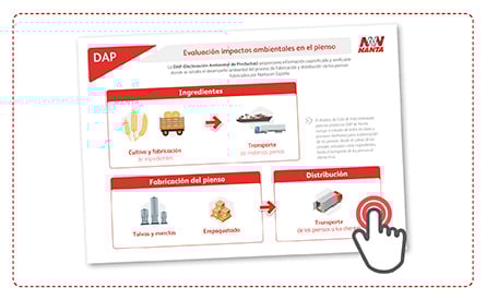 La DAP (Declaración Ambiental de Productos) detalla el desempeño ambiental del proceso de fabricación y distribución de los piensos fabricados por Nanta en España. Estos piensos permiten al ganadero avanzar hacia alianzas para llevar a cabo la DAP de sus producciones.