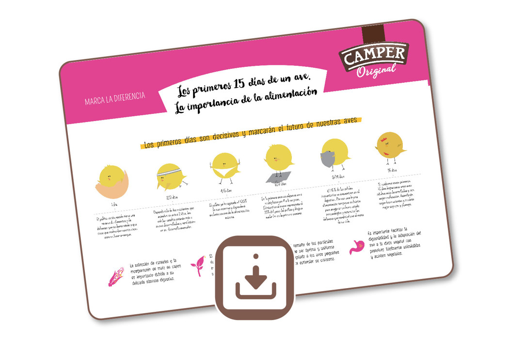 Camperbroiler Iniciación es el alimento indicado para las cuatro primeras semanas de vida de los pollos caseros. Un alimento muy alto en nutrientes, especialmente en proteína y aminoácidos, y con una alta palatabilidad y digestibilidad, lo que permite que el pollito tenga un correcto desarrollo en sus primeros días de vida. El adecuado equilibrio calcio/fósforo, junto con el elevado contenido en vitamina D, resultan claves para una correcta osificación. Un buen desarrollo óseo desde el comienzo que redundará en un crecimiento equilibrado y en una gran fuerza y vitalidad del pollo.