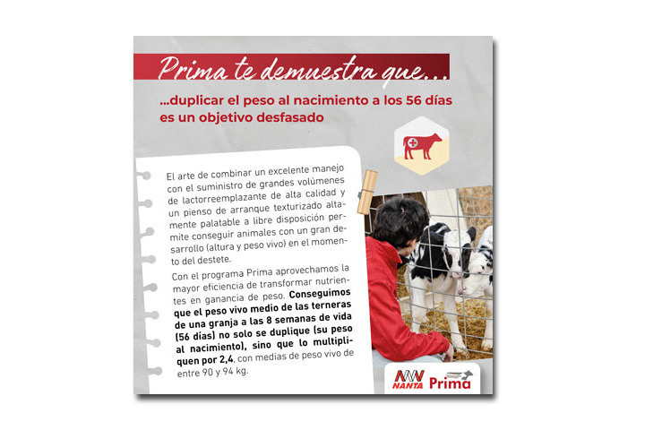 Con el programa Prima aprovechamos la mayor eficiencia de transformar nutrientes en ganancia de peso. Conseguimos que el peso vivo medio de las terneras de una granja a las 8 semanas de vida (56 días) no solo se duplique (su peso al nacimiento), sino que lo multipliquen por 2.4, con medias de peso vivo entre 90 y 94 kg de peso vivo.