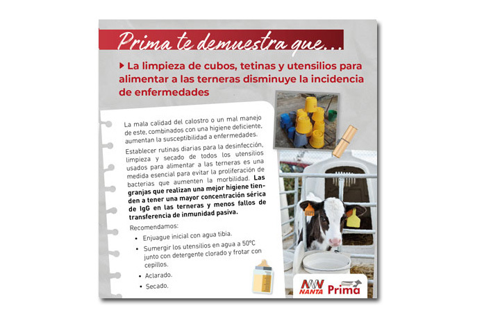 Establecer rutinas diarias para la desinfección, limpieza y secado de todos los utensilios usados para alimentar las terneras es una medida esencial para evitar la proliferación de bacterias que aumenten la morbilidad. Las granjas que realizan una mejor higiene tienden a tener una mayor concentración sérica de IgG en las terneras y menos fallos de transferencia de inmunidad pasiva.