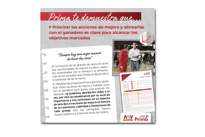 El Checklist del programa PRIMA permite identificar todas las áreas de mejora y trabajar junto con el ganadero para darles una solución. Pero no podemos abordarlas todas a la vez, por ello las ponderamos por su nivel de importancia y nos enfocamos en un máximo de sólo 2 o 3 áreas de mejora en función de su relevancia, viabilidad y limitaciones de cada granja. Una vez corregidos, nos fijamos nuevos objetivos y nuevas áreas de mejora.