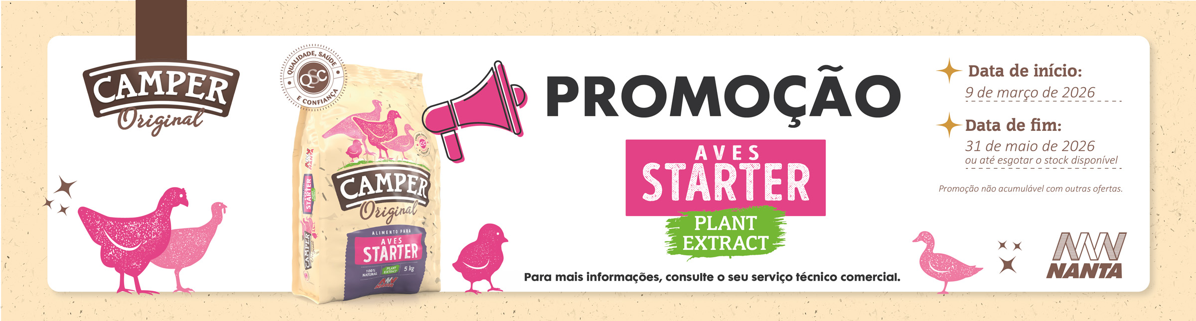 A gama Camper da Nanta é uma linha completa de alimentos para aves domésticas e coelhos, especialmente desenvolvida para aqueles que apreciam de coisas caseiras.
