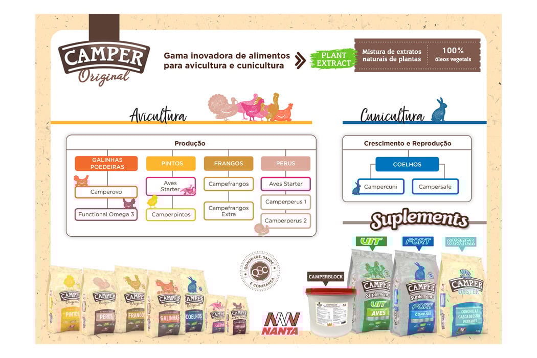 A gama Camper inclui alimentos e suplementos para cada fase da vida de galinhas, frangos, aves de recria e coelhos domésticos.