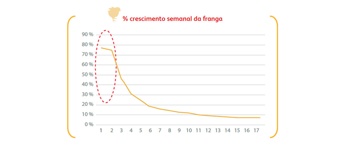 Para que as frangas de recria iniciem a postura, é imprescindível que disponham de um elevado índice de massa muscular, com a alimentação da primeira semana de vida podemos contribuir para que as frangas atinjam antes a sua condição corporal ótima e antecipem o início da postura.